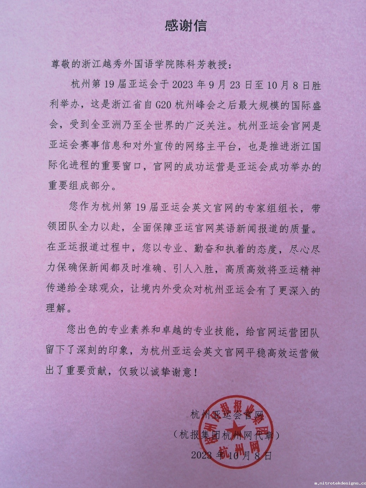 受亚运会官网负责人的邀请,陈科芳教授担任亚运会官网英文专家组组长。凭借娴熟的英语水平和严谨的专业态度,带领团队仔细审阅和翻译新闻稿,保证了亚运会官网的英语报道及时准确,高质高效。她团队的努力工作使全球观众更加深刻理解亚运精神,让国际友人更加了解杭州,了解中国。