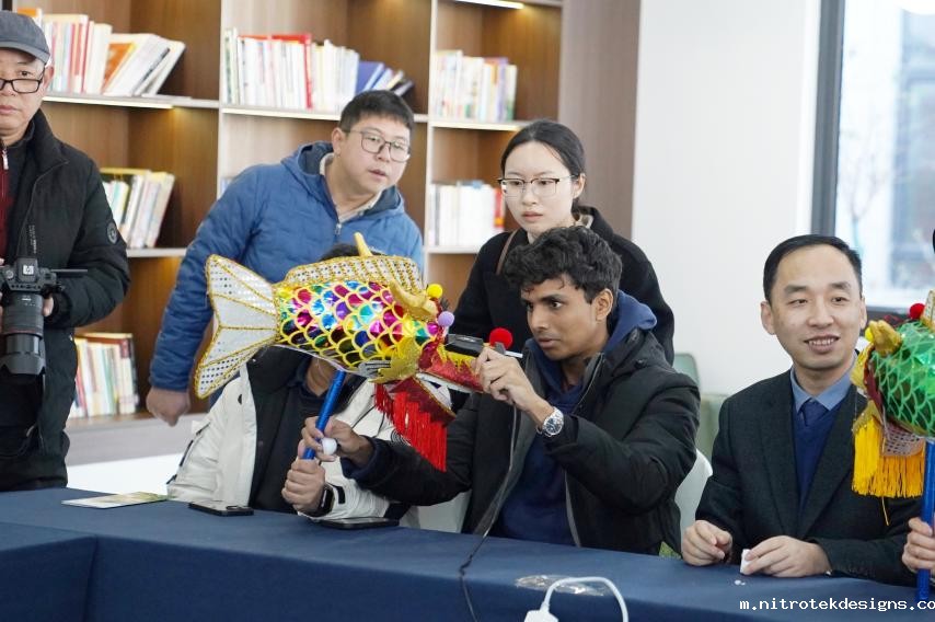 图8:翻译系学生王云娜为驻华外交官及使节夫人们体验制作非遗文化“鳌鱼灯”提供陪同口译