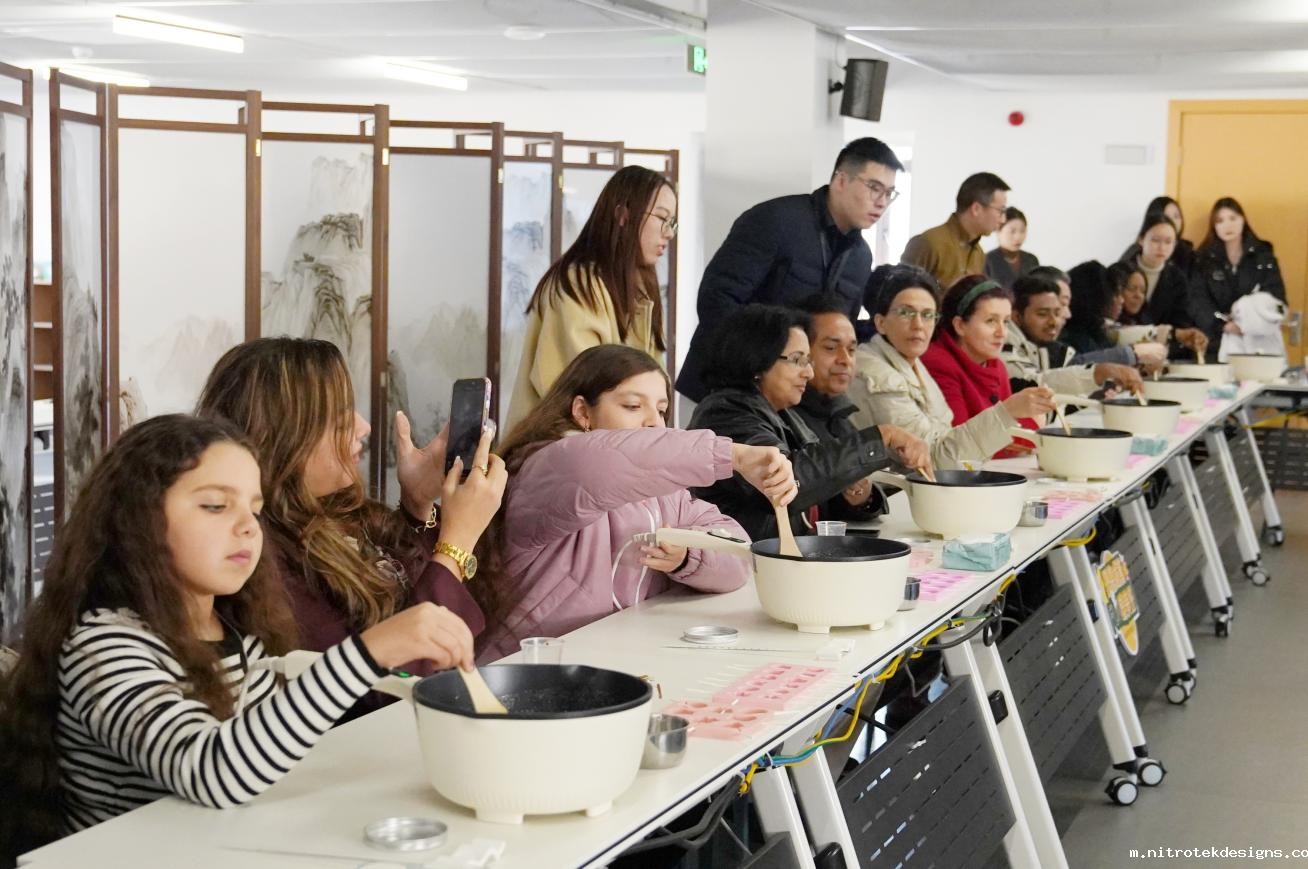 图5:翻译系学生宋锦涛为驻华外交官和使节夫人们体验制作小热昏联名产品梨膏糖提供陪同口译