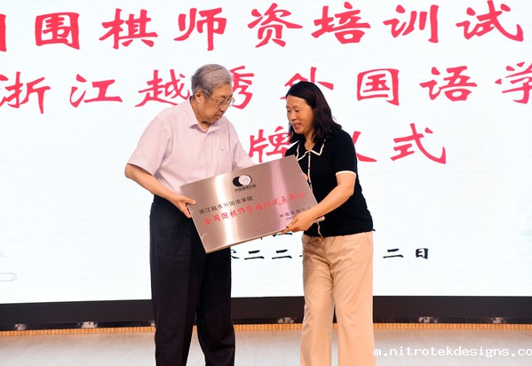 中国围棋协会主席林建超为我校授全国第三批围棋师资培训试点单位牌匾,校体育部主任张岚接牌。
