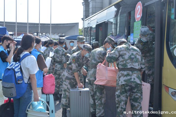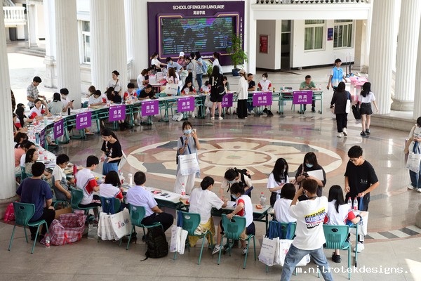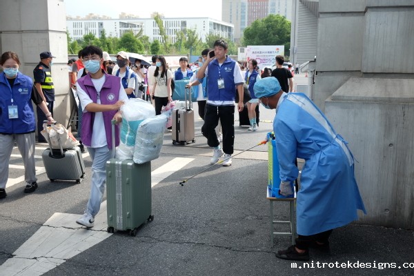 在各学院报到点,志愿者们认真负责,引导新生办理入学手续。校园内的摆渡车不断往返于校门口与宿舍之间运送新生。教官队协助医护人员开展核酸检测工作。阳光下,被汗水浸透的各色志愿者马甲是校园里最靓丽的风景线。