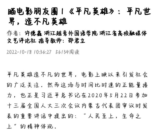 据悉,浙江省高校融媒体文艺评论社将在本月末陆续推出《海的尽头是草原》《万里归途》《平凡英雄》等影片评论专辑,组织社员踊跃参与由瞄电影、浙江省青年网络协会、浙江省电影放映协会主办的“红色季”主题电影评论活动“红色时光”,让青年学生在提笔落笔之间感悟主旋律电影的生命力量,更好地为形成同心共圆中国梦的青春合力出一份力。