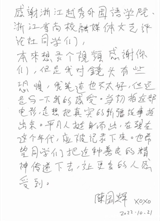近期《平凡英雄》导演陈国辉通过网络平台发来一封手写信,与我校中文学院学生“隔空互动”。信中写道:“感谢星空app官方网站登录入口、浙江省高校融媒体文艺评论社的同学们,本来想录个视频感谢你们,但是我对镜头有些恐惧,我笔迹也不太好,但还是写一下我的感受。当初拍这部电影,是想把真实的新疆故事拍出来。平凡人挺身而出,在现在这个年代应该被记录下来。也希望同学们把这种善良的精神传递下去,让更多的人感受到。”