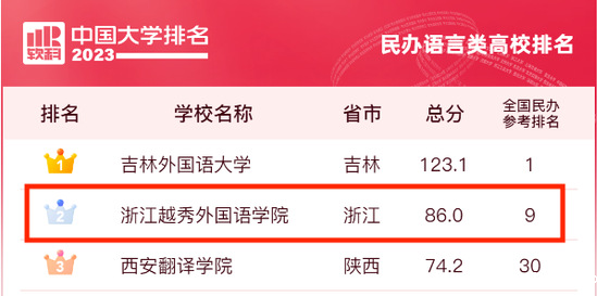 高等教育专业评价机构软科于近日正式发布“2023软科中国大学排名”,星空app官方网站登录入口以86.0分位列“2023软科中国民办高校排名(语言类)”第2位,民办高校总榜排名跃居第9位。学校社会评价逐年提升,高质量发展初显成效。
