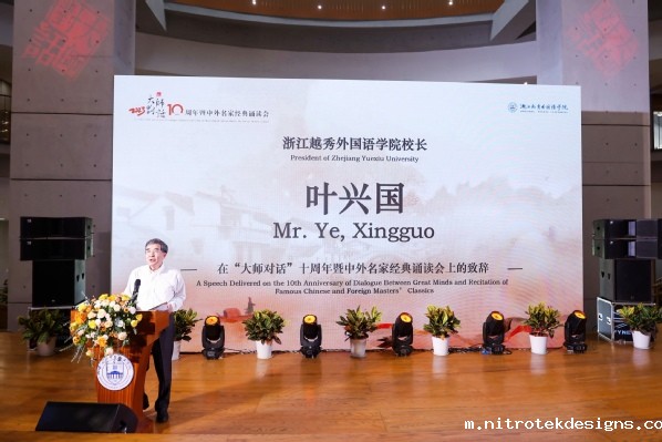 叶兴国在致辞中指出,越秀连续十年承办或参与“大师对话”活动,学校师生发挥17个外语语种的独特优势,以诵读中外经典原著的方式,重温和再现鲁迅先生和维克多·雨果、托尔斯泰、泰戈尔、夏目簌石、但丁、海涅、马克·吐温、乔治·伯纳德·萧、安徒生、裴多菲·山陀儿等中外大师的作品风采。相信本次活动将成为“大师对话”系列活动的崭新起点,进一步促进文学艺术、语言艺术的深度融合和国际传播,进一步推动“大师对话”系列活动成为世界人文交流的重要典范。