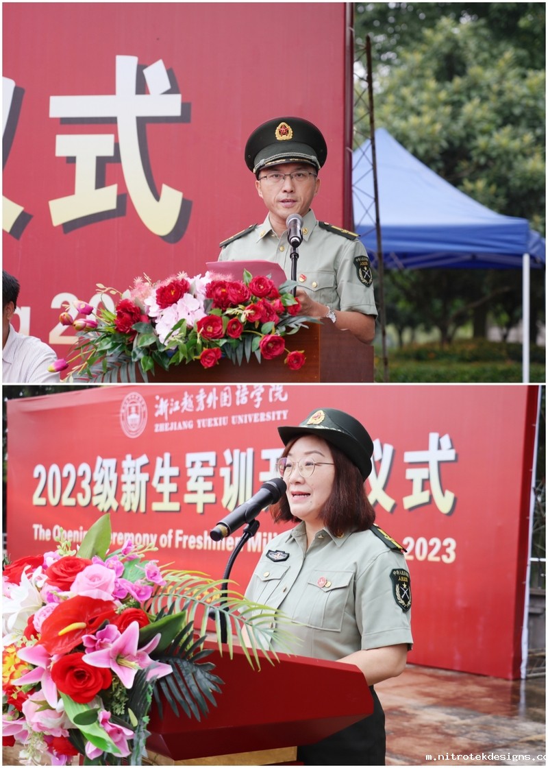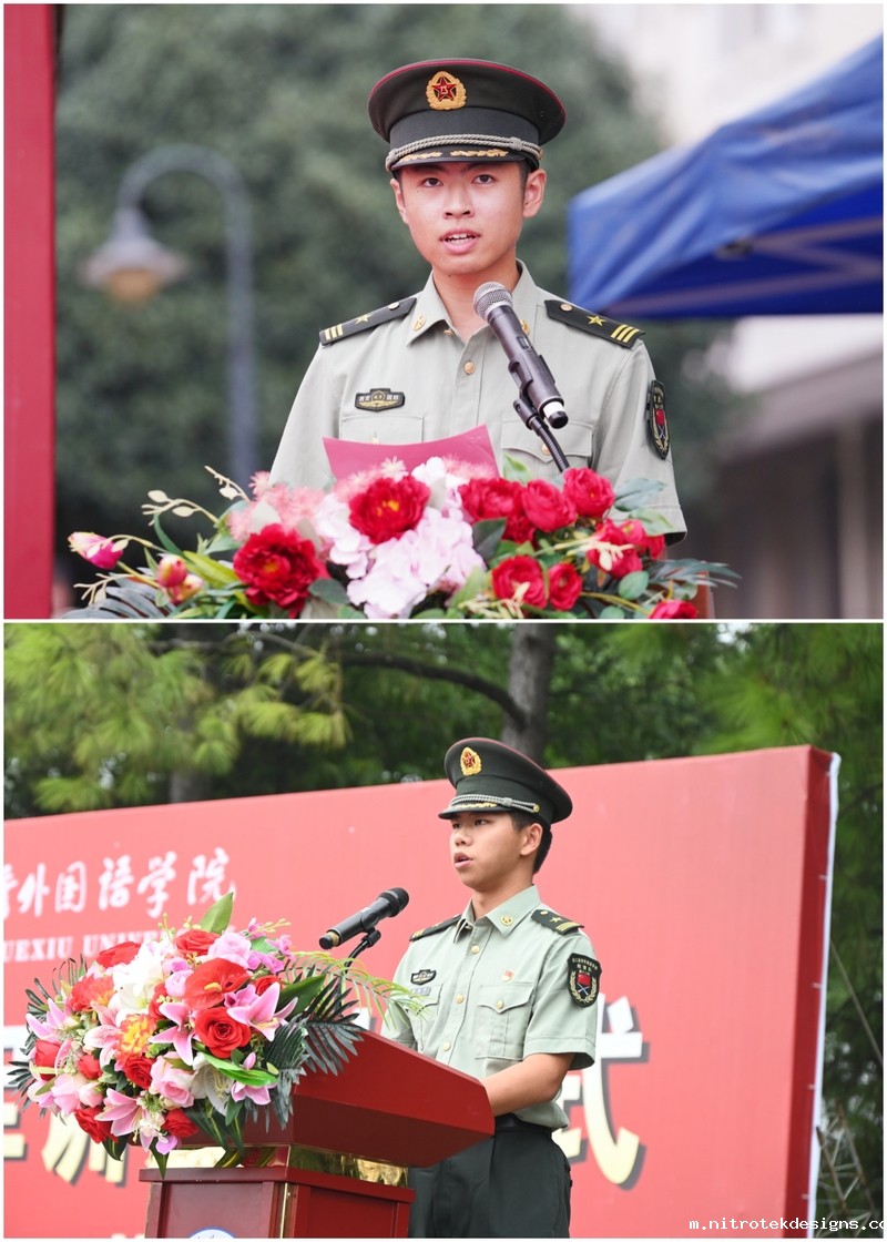 数字贸易学院物流管理2001班韩邵梁,英语学院商英2002班徐毓熙作为教官代表进行发言,并郑重承诺,以良好的军人形象过硬的军事本领,引领2023级新生在此次军训中提高政治思想觉悟,增强集体主义精神和国防观念,服务保障学生圆满顺利地完成军训任务。