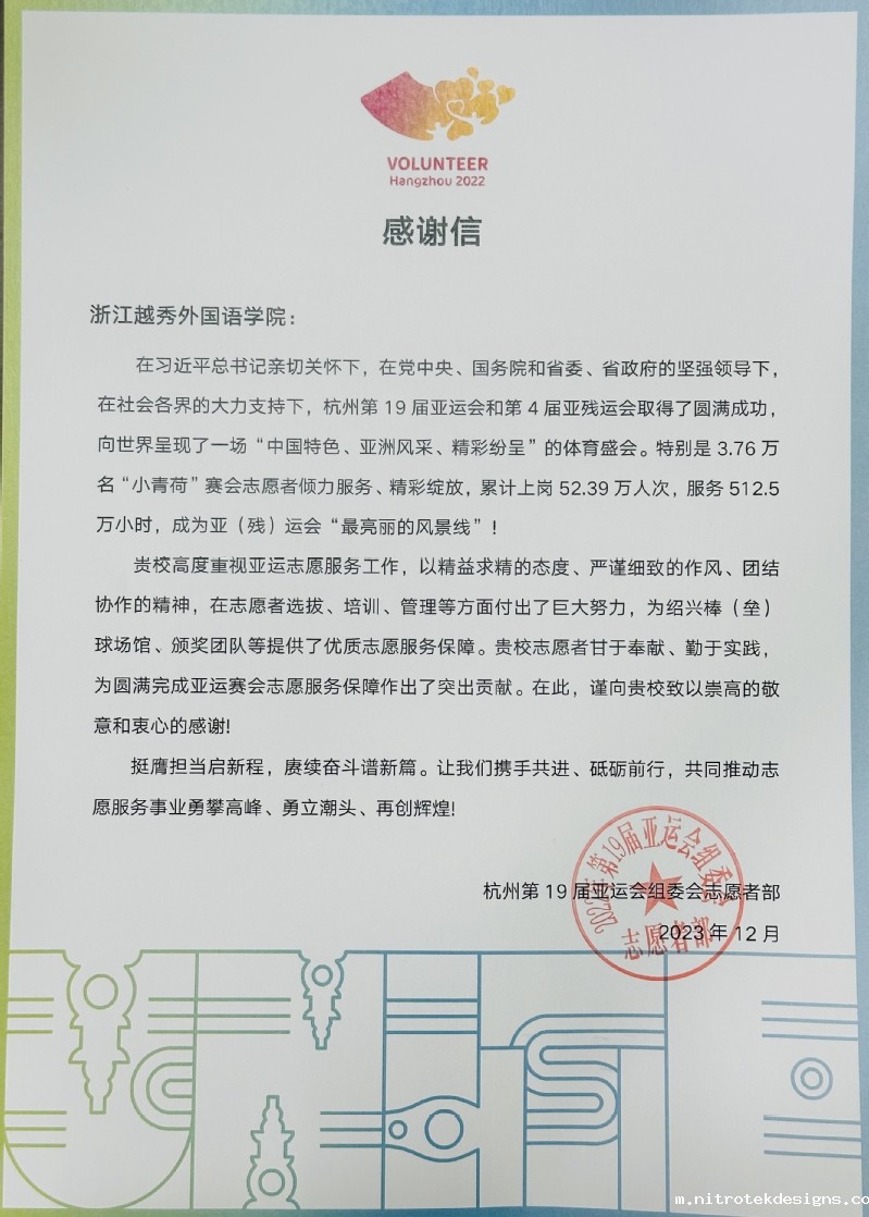 自从杭州第19届亚运会筹办以来,我校凝心聚力开展亚运志愿者各项管理工作,选派6名领队教师、881名学生志愿者投入亚运会赛事志愿服务工作,参与人数为在绍高校之最。其中863名越秀“小青荷”共服务了棒球和垒球两个项目47场比赛、50场训练赛,服务观众90098人,累计志愿服务时长超过130000个小时,服务了泰国、菲律宾、老挝、新加坡、中国、日本、韩国、香港、中国台北等队伍。场馆21个业务领域81个岗位中都有他们的身影。另有18名小语种学生赴杭州萧山机场担任抵离迎送组志愿服务活动,从9月6日到10月31日,共计服务56天,总服务时长10000余小时。越秀“小青荷”用热情周到的服务、温暖友善的态度全力保障杭州亚运会的顺利举行,书写了属于新时代中国青年的青春华章。