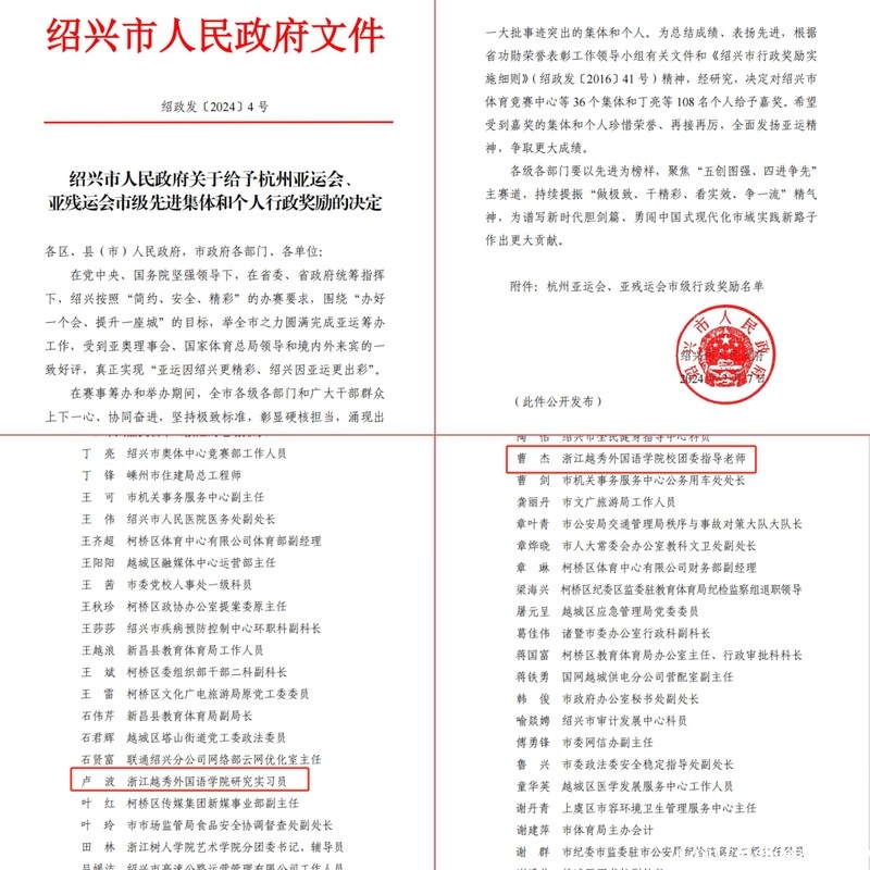 学生处(团委)曹杰、国际商学院卢波两位老师荣获绍兴市人民政府授予的“杭州亚运会、亚残运会绍兴市级个人行政奖励”。