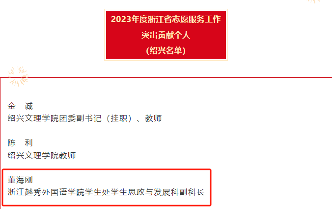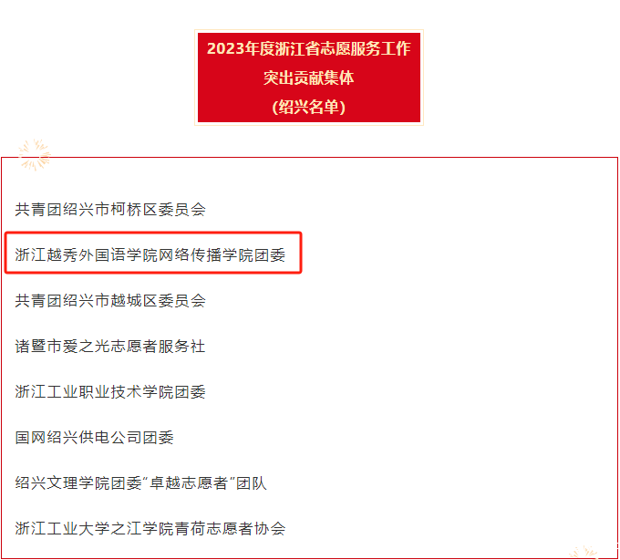 在共青团浙江省委、省志愿者协会举办的2023年度浙江省志愿服务工作突出贡献集体和个人评选中,我校网络传播学院团委荣获省志愿服务工作突出贡献集体荣誉称号,学生处(团委)董海刚老师荣获省志愿服务工作突出贡献个人荣誉称号。