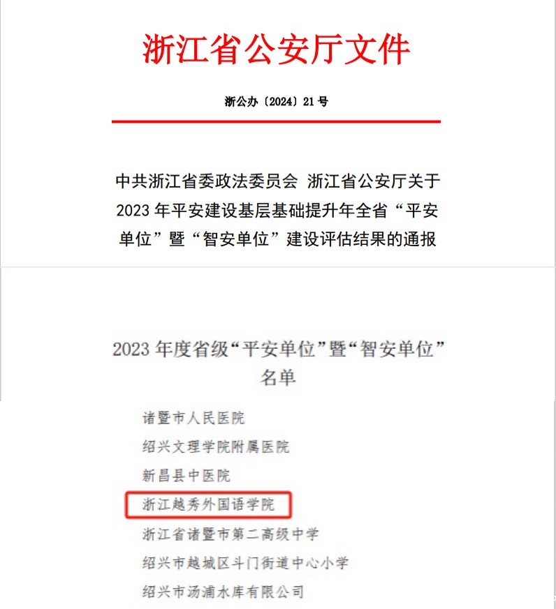 近日,中共浙江省委政法委员会、浙江省公安厅下发《关于2023年平安建设基层基础提升年全省“平安单位”暨“智安单位建设评估结果的通报》,我校再次榜上有名,这也是学校连续第三年获此殊荣。