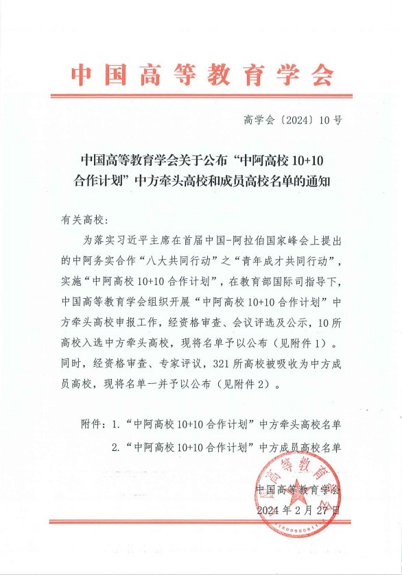 近日,中国高等教育学会公布“中阿高校10+10合作计划”中方牵头高校和成员高校名单,我校入选中方成员高校。