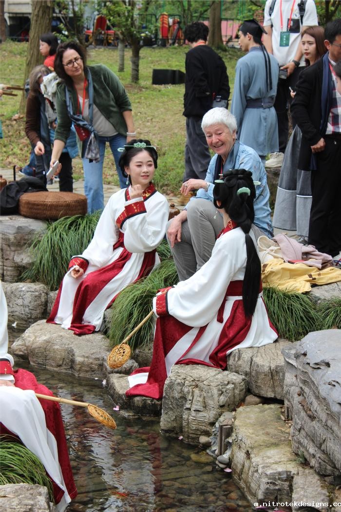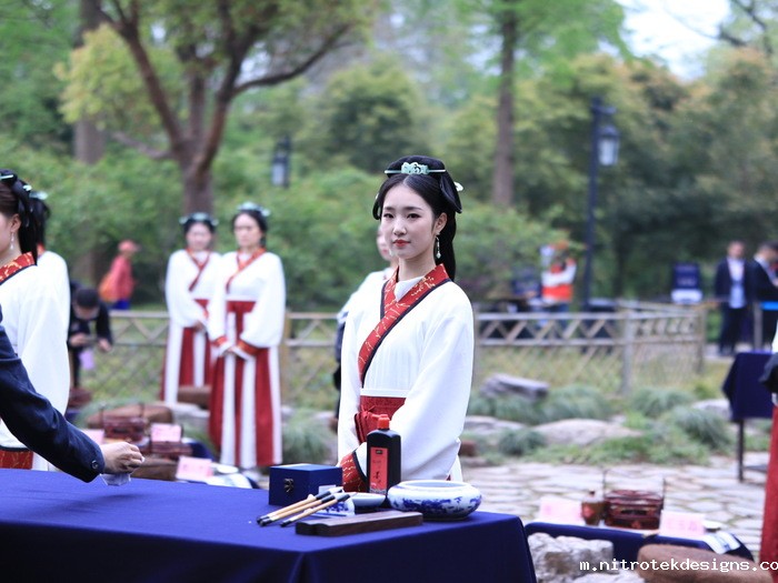 曲水流觞,诗文吟咏。来自海内外的书法家和嘉宾,在曲水边品酒、赋诗、挥毫。艺术学院舞蹈系的学生,参加了“曲水流觞”活动的演出。她们用优美的舞蹈,生动诠释了书法艺术的魅力,相得益彰。让人们仿佛穿越时空,亲眼目睹了当年王羲之等文人雅士曲水流觞、吟诗作赋的场景。