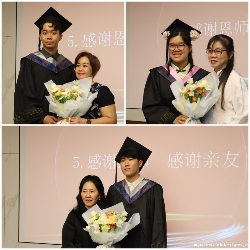 部分留学生家长们不远万里来到越秀,满怀期待地参与了本次典礼,并对孩子们顺利完成学业表示祝贺,也对学校的精心栽培表示感谢。毕业留学生代表黄彦臻、董加源、李涛良为到场亲友送上自己的礼物,并对家人的支持与栽培表示感谢。毕业生们纷纷为教师们献花,感谢各位老师的辛勤付出和用心培养。