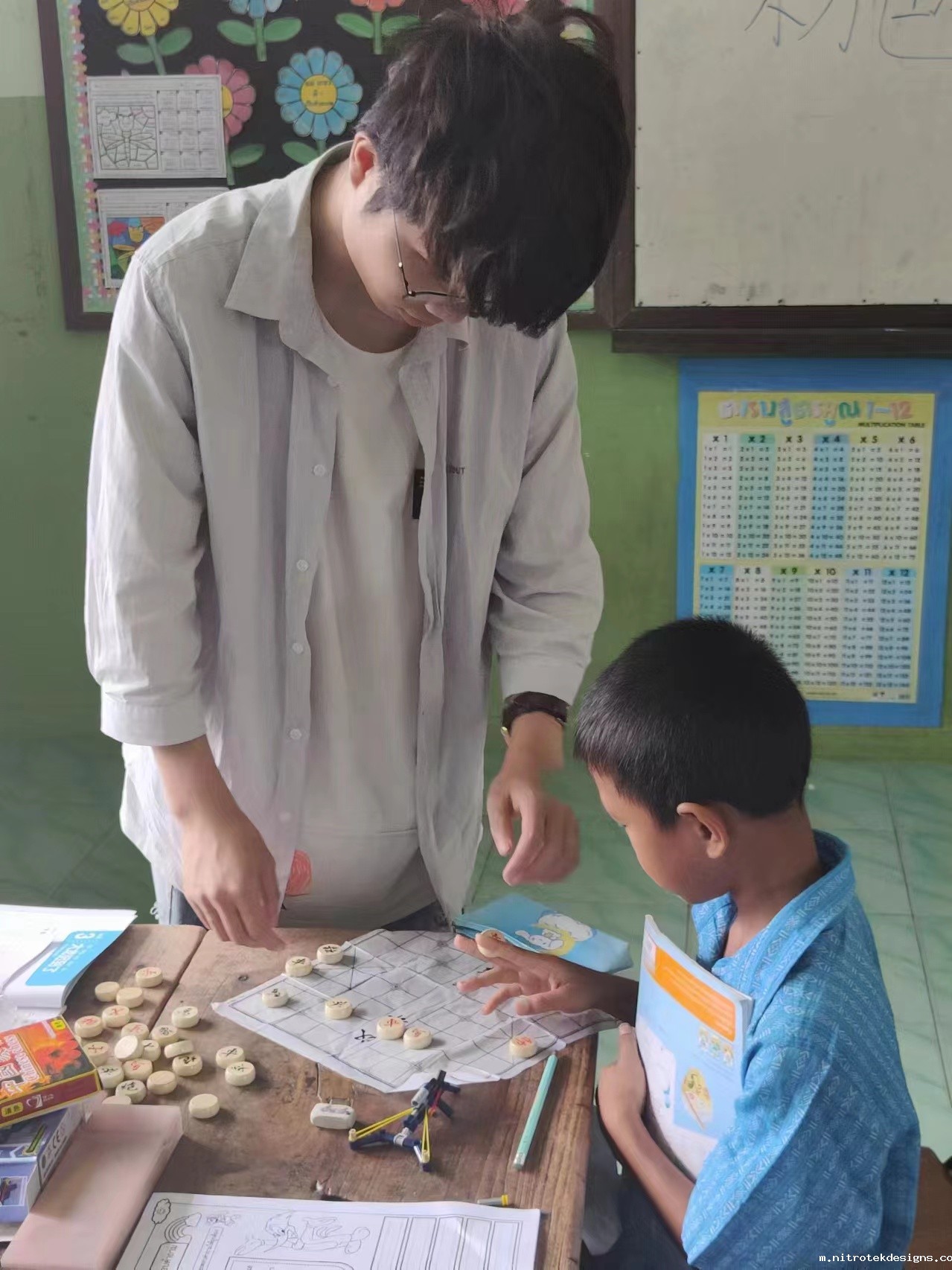 团队成员向孩子们介绍了中国象棋的悠久起源和基本规则,同时细致入微地解析了每一枚象棋上汉字所蕴含的深远意义。泰国小朋友迫不及待地开始了实践。在团队成员的悉心指导下,他们逐步学习了如何摆放、移动棋子,理解不同棋子的独特走法与战术布局。尽管刚开始时有些许困难,但孩子们展现出了超乎想象的耐心与学习能力。他们围坐棋盘旁热烈讨论,积极探讨每一个棋局的最佳策略。小小的教室里回荡着思维碰撞的火花与对胜利的渴望。