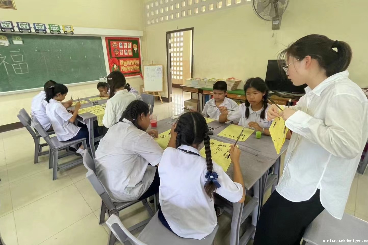 在素攀武里府的Watdanchang学校,活泼的泰国小朋友们在团队老师的悉心指导下,认真学习中国书法。通过实践,孩子们不仅掌握了书法的基本要领,还深入理解了“福”字背后丰富的文化内涵,感受到了汉字的无穷魅力。