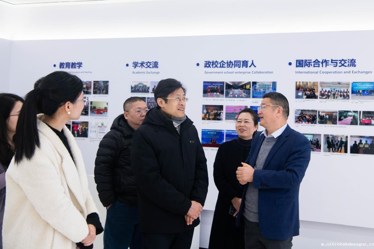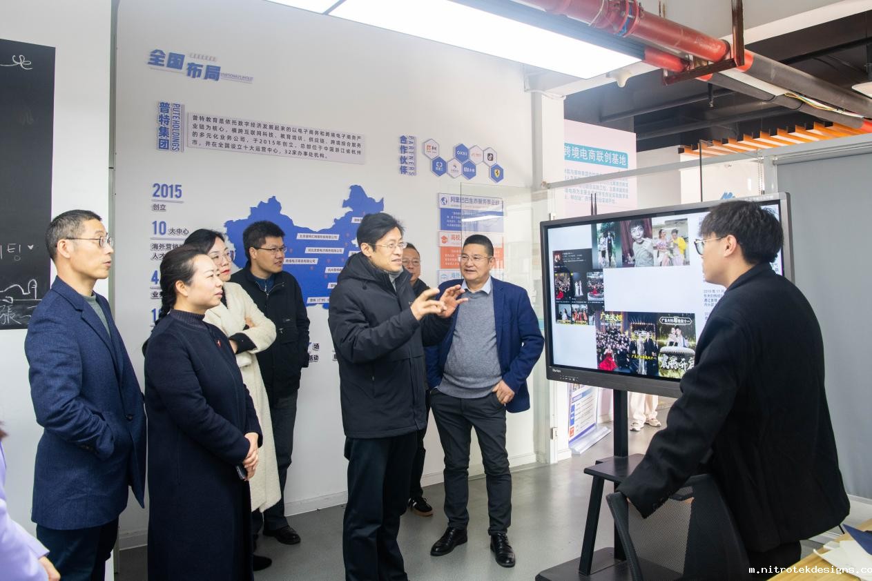 刘建国总编一行先来到大学生创业园(省级创业孵化示范基地),详细了解园区的孵化机制、运营模式及取得的成效。单胜江院长向考察组一行介绍了园区的基本运行情况,并从近年来先后引入10余家数字贸易领域企业和本地特色产业生产型企业,以打造“教育、科技、人才”一体化发展的一站式协同育人生态为基础,以共同培养全球化数字贸易应用型人才为目标,共建专业、共培师资、共同授课、共编教材、共享成果等做法,并介绍了近年来培养孵化的优秀创业典型案例。刘建国来到普特联创区,看到企业导师正在为直播电商辅修班集体备课时,饶有兴趣的与企业老师交流,了解学生报名情况和企业用人需求及具体授课内容安排;并进入创业团队工作室,了解创业情况及体会;最后来到哲创空间,看到企业带着产品、技术、人员、平台、设备进入学校,手把手教学生了解产品、创作产品并开展国际贸易业务时,刘建国总编表示高度赞赏,并指出这种“理论与实践相结合”“学校和校外相融合”“国内和国际相结合”的人才培养方式不仅有助于提高学生的国际视野、就业核心竞争力,也为社会培养了一批具有创新精神的应用型人才,助推区域经济社会发展。