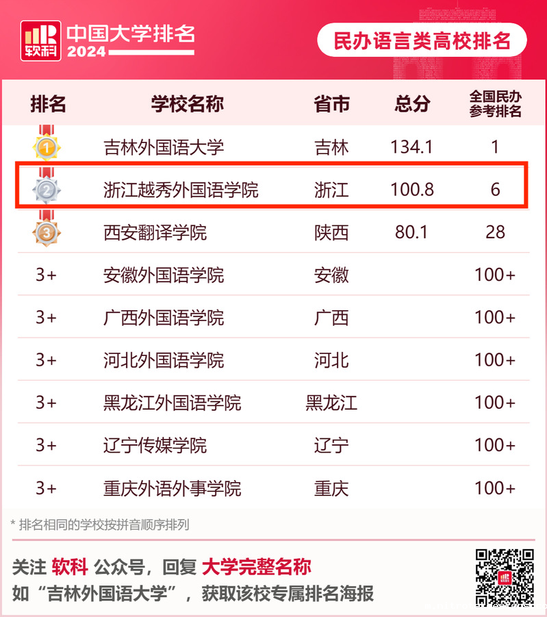 根据高等教育专业评价机构软科正式发布“2024软科中国大学排名”。我校并列“中国民办高校排名(总榜)”第6名,较2023年排名上升3名,创下新高。同时以100.8的总分再次位列“2024软科中国民办高校(语言类)排名”第2名,充分反映了我校的办学实力和内涵建设成果。