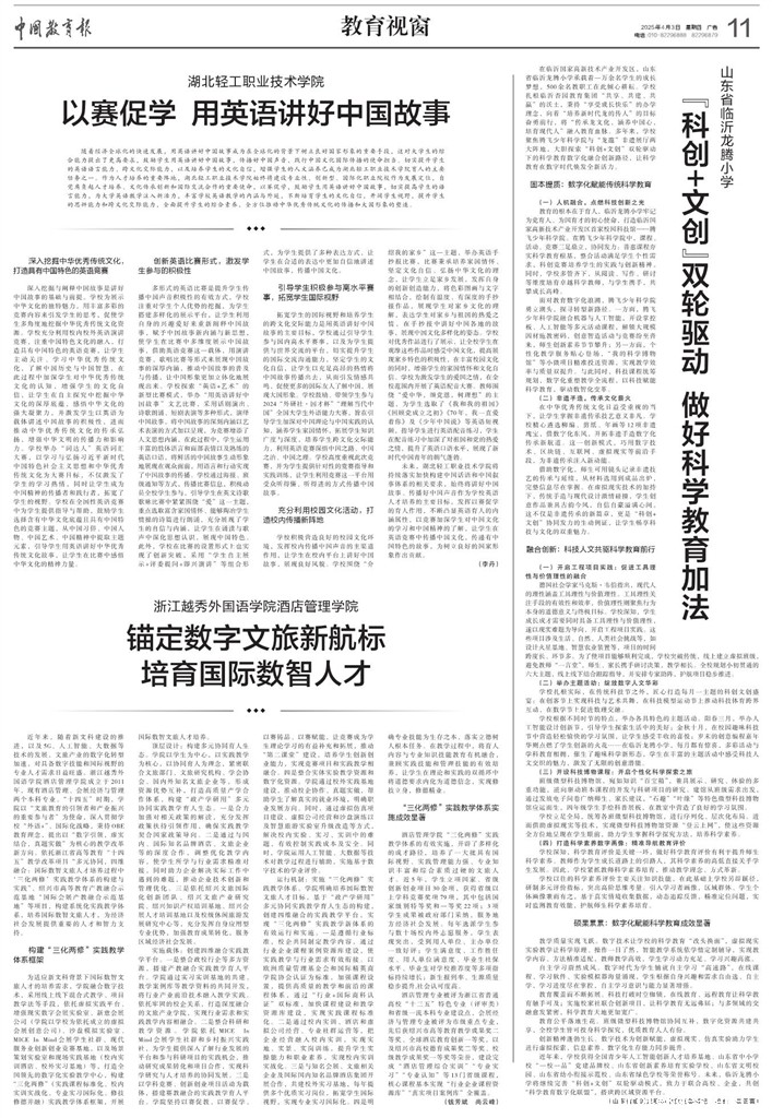 2025年4月3日《中国教育报》第11版刊发了《星空app官方网站登录入口酒店管理学院:锚定数字文旅新航标 培育国际数智人才》,深入报道了我校酒店管理学院通过构建多元协同实践教学育人生态和四维融合的实践教学平台,以“三化两修”实践教学体系为核心,培育国际数智文旅人才,为产业发展提供重要的人才和智力支持,取得了显著成效。全文刊登如下: