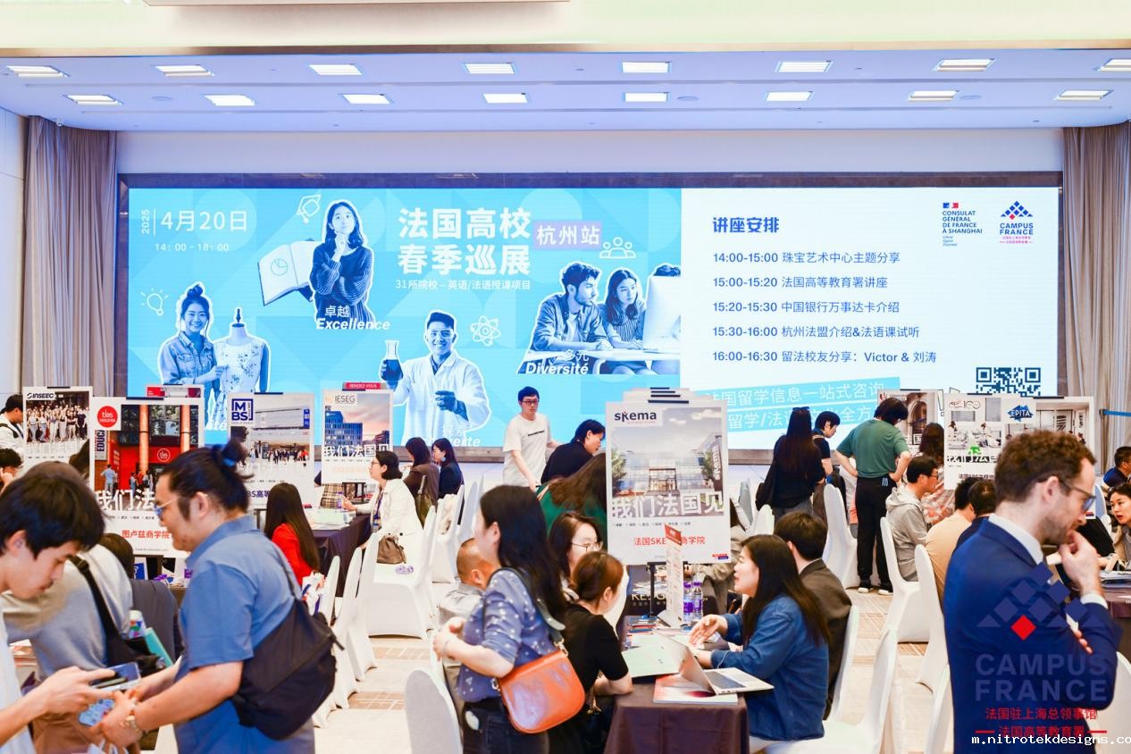 2025年4月,应用外语学院师生赴杭州参加了“2025法国高校春季教育展”。此次展会汇聚了包括巴黎西岱大学、法国北方高等商学院、南特高等商学院等在内的33所法国知名高校,为有意赴法留学的中国学子提供了全方位的咨询服务。