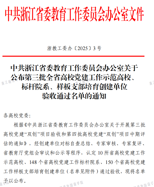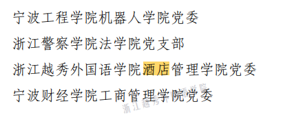 近日,浙江省教育工委公布第三批全省高校党建工作示范高校、标杆院系、样板支部培育创建单位验收结果。我校酒店管理学院党委凭借扎实的党建工作基础、创新的育人模式及显著的建设成效顺利通过验收,正式获评浙江省高校党建工作标杆院系。
